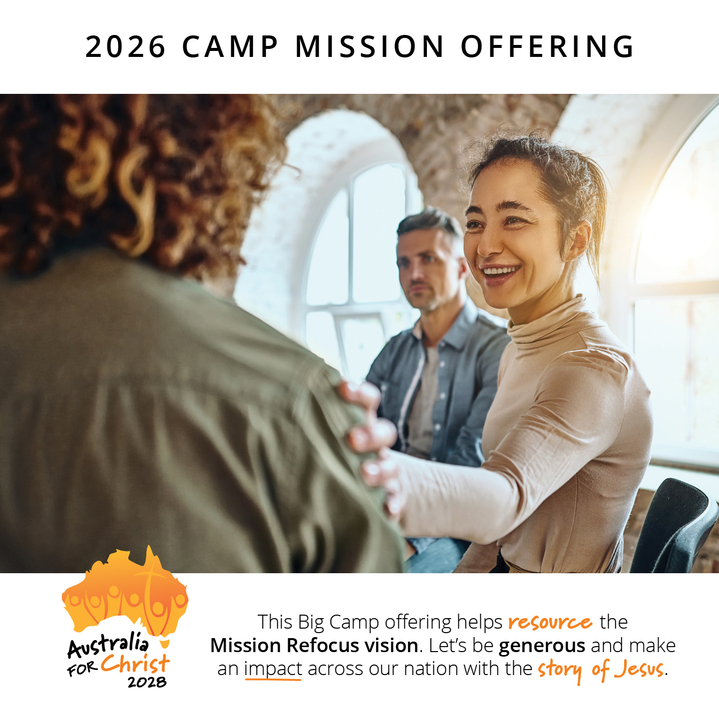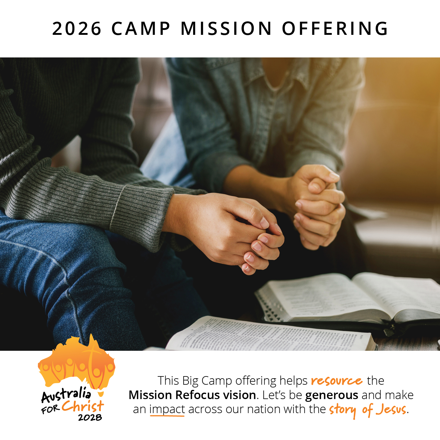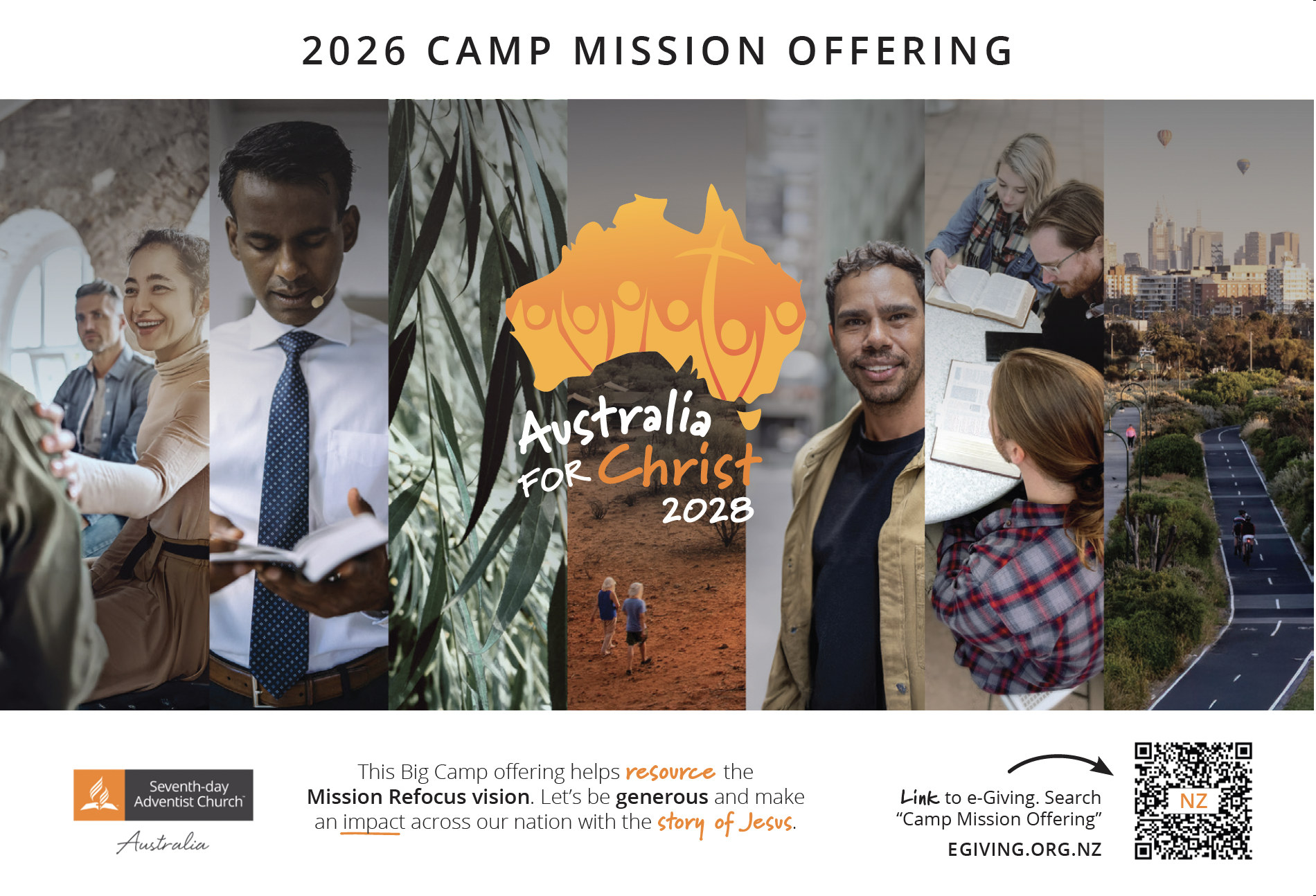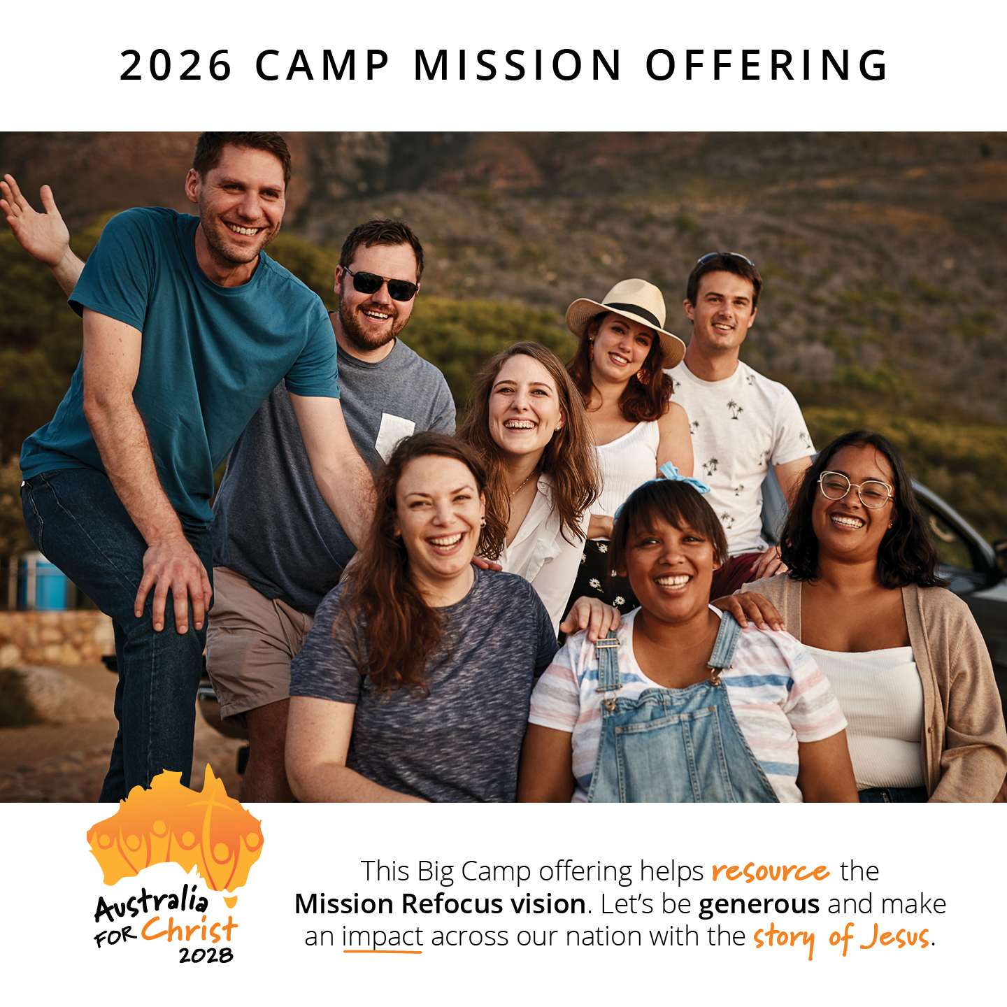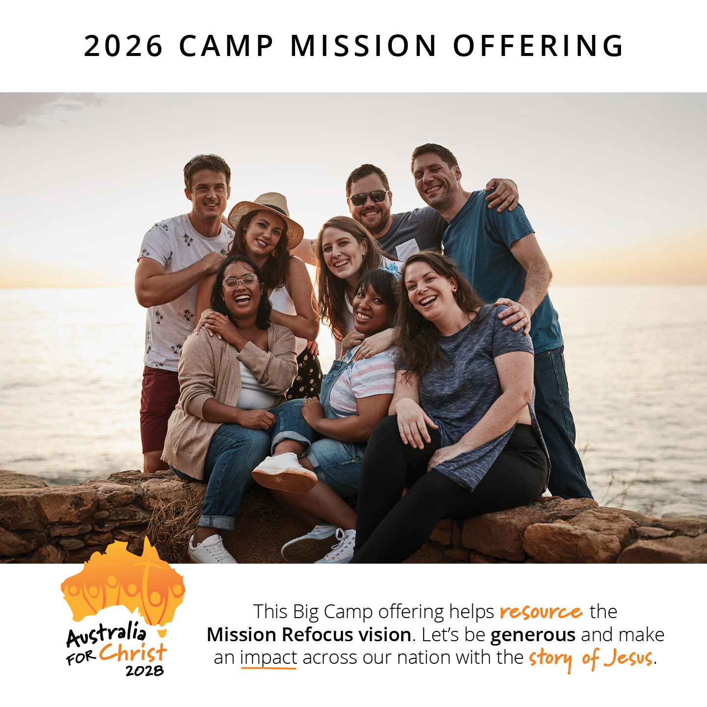 The 2026 Camp Mission Offering will be used to powerfully take the gospel of Jesus Christ to everyday Australians. Australia for Christ 2028 is the recipient of this year’s offering, and it is shaping up to be the most powerful, Christ-centred, mission outreach ever undertaken in this nation. Please give generously, and sacrificially, as we work together lift up Jesus across Australia.
