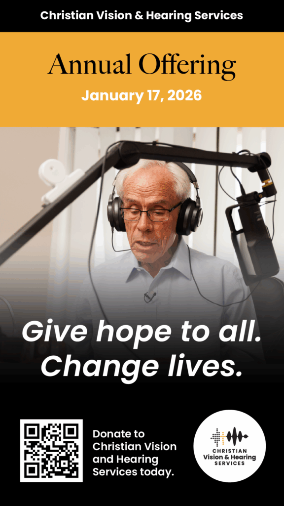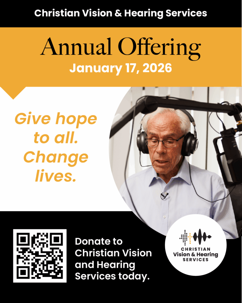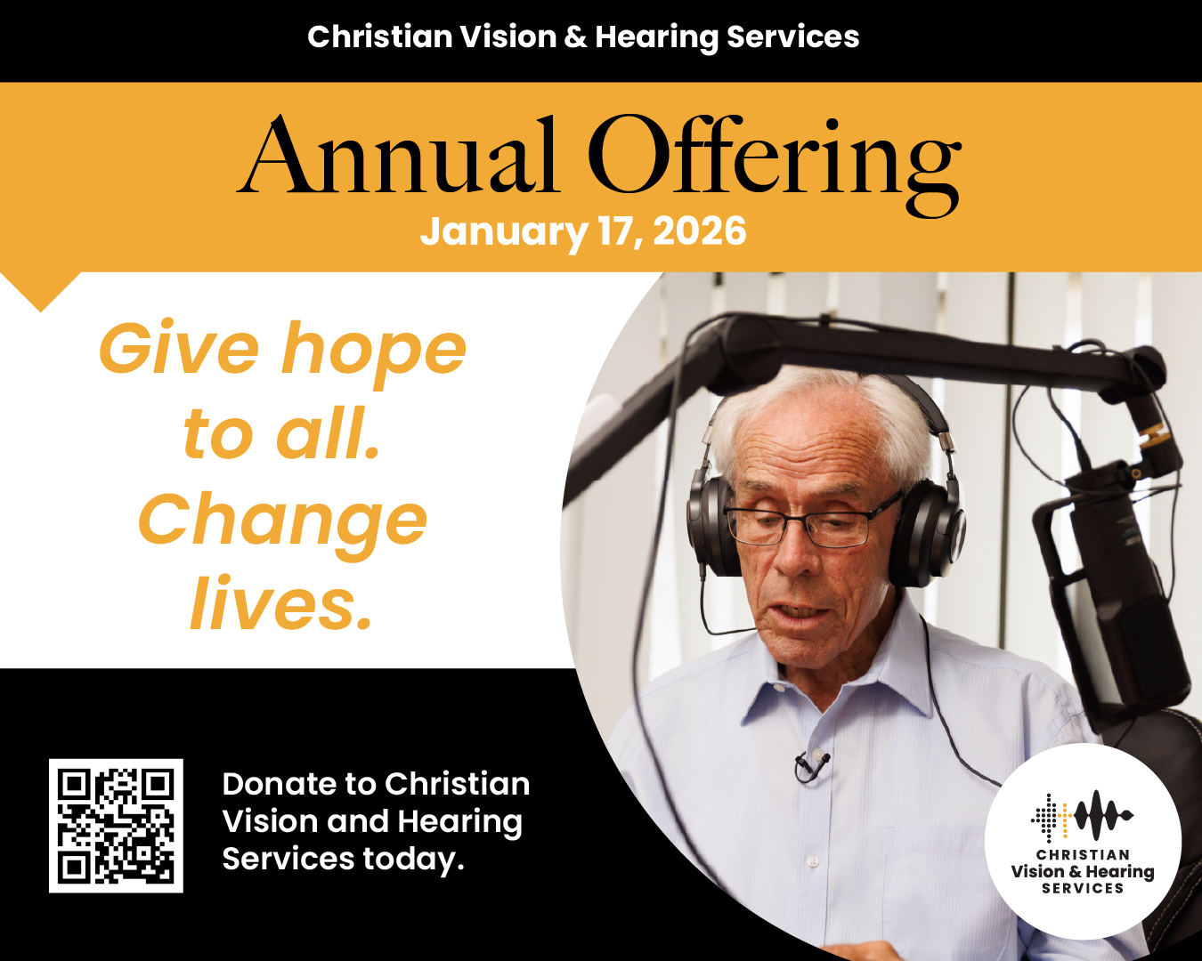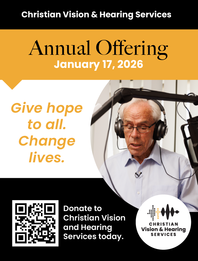 Christian Vision and Hearing Services, within Adventist Media, is a non-profit organisation that serves people who are blind, have low vision, cannot read standard print due to a physical condition, are Deaf, hard of hearing or deafblind in the South Pacific Division. It provides vital services and support to these communities free of charge, made possible by this annual church offering, donations and bequests. Please give generously to ensure the important work of Christian Vision and Hearing Services can continue and expand in 2026. You can also make an online, tax-deductible donation at any time via eGiving. Thank you.